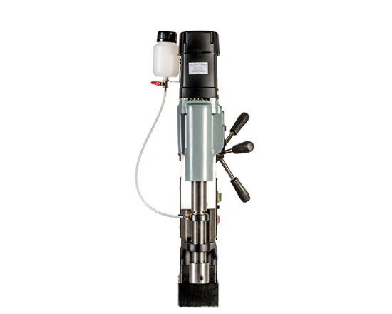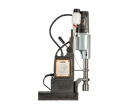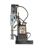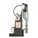 Furadeira reversível de base magnética 220V – 1800W, possui 4 rotações 82 / 180 / 245 / 535RPM, capacidade de perfuração de 13 até 100mm e profundidade de corte até 60 mm. Comando de reversão para confecção de roscas internas até M42. Pode utilizar brocas maciças ou fresas anulares. Força de atração 32000N.