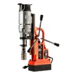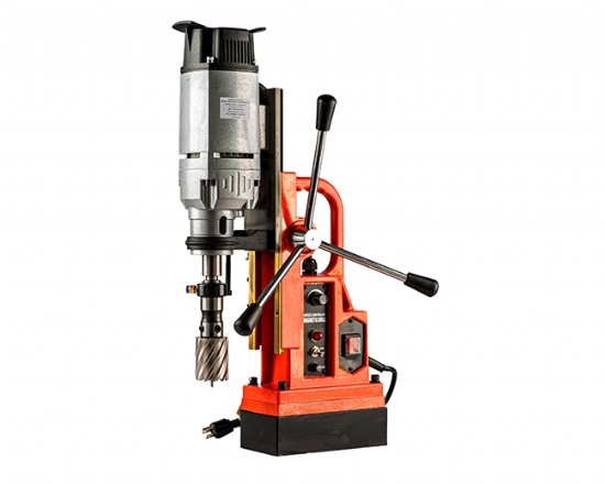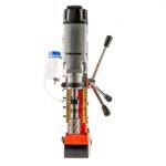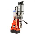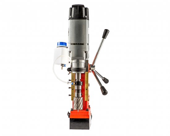 Fixação por atração eletromagnética com base duplo magnetismo, ajustável em cerca de 60º para ângulo de rotação e 8mm no sentido longitudinal. Força de atração de 12.000N. Luz indicativa no painel quando eletroimã ativado. Furadeira para brocas cone morse e mandril para brocas anulares com lubrificação interna. Pode ser utilizado mandril B 16 com adaptador.