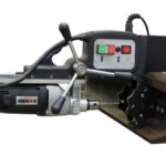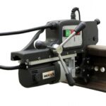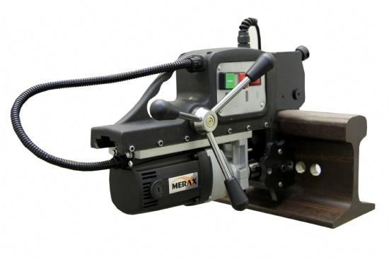 Furadeira para trilhos ferroviários RD-35. Elétrica 220V – 1200 w, 570 RPM com capacidade de perfuração de 13 a 35 mm de diâmetro e curso de 50 mm, com suporte especial para trilhos ferroviários. Utiliza fresas anulares especiais para trilhos.